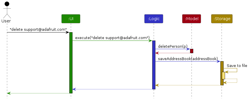The Sequence Diagram below shows how the components interact with each other for the scenario where the user issues the command delete support@adafruit.com.
