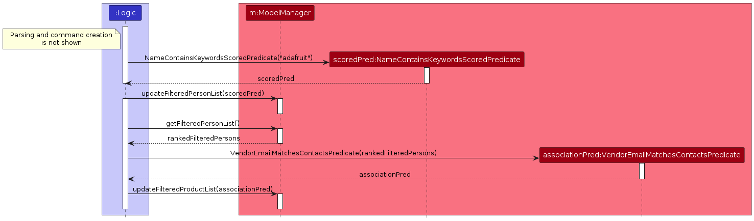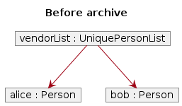 Person objects (which are contained in a UniquePersonList object).Product objects (which are contained in a UniqueProductList object).Person/Product objects as a separate filtered list which is exposed as an unmodifiable ObservableList<Person>/ObservableList<Product>.VersionedVendorVault object that represents the current state of the address book and inventory data, and supports undo/redo operations on it.Alias objects (which are contained in a AliasList object).UserPref object that represents the user’s preferences. This is exposed as a ReadOnlyUserPref object.Archived records are kept in the same data structures rather than moved to a separate list: