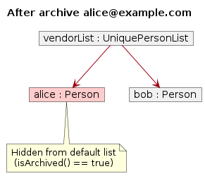Step 2. The user executes archive alice@example.com. Alice's Person object is replaced with a copy that has the "archived" tag added. Because the active filtered list excludes archived persons, Alice disappears from the main view.