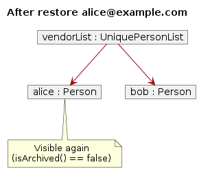 Vendor archiving — Person uses a tag-based approach: isArchived() checks whether the person's tag set contains an "archived" tag. Person#archive() returns a new Person with the tag added; Person#restore() returns a new Person with the tag removed.