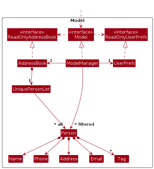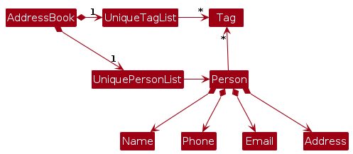 Person is considered archived when its tag set contains the reserved "archived" tag. Person#archive() / Person#restore() return new immutable copies with the tag added or removed.Product carries a dedicated boolean isArchived field. Product#archive() / Product#restore() return new immutable copies with the flag toggled.Note: An alternative (arguably, a more OOP) model is given below. It has a Tag list in the AddressBook, which Person references. This allows AddressBook to only require one Tag object per unique tag, instead of each Person needing their own Tag objects.