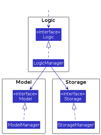interface with the same name as the Component.{Component Name}Manager classFor example, the Logic component defines its API in the Logic.java interface and implements its functionality using the LogicManager.java class which follows the Logic interface. Other components interact with a given component through its interface rather than the concrete class, as illustrated below.