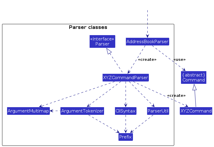 AddressBookParser class creates an XYZCommandParser (XYZ is a placeholder for the specific command name e.g., AddCommandParser) which uses the other classes shown above to parse the user command and create a XYZCommand object (e.g., AddCommand) which the AddressBookParser returns back as a Command object.XYZCommandParser classes (e.g., AddCommandParser, DeleteCommandParser, ...) inherit from the Parser interface so that they can be treated similarly where possible e.g, during testing.add support warnings which are generated at 2 levels: