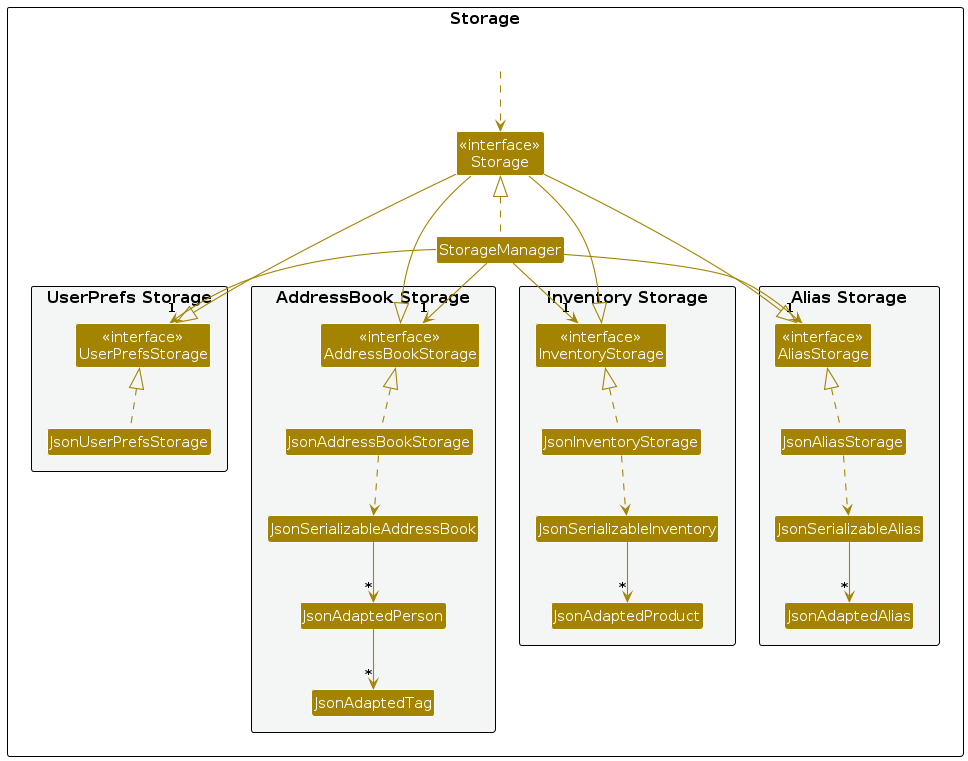 AddressBookStorage, InventoryStorage, AliasStorage and UserPrefStorageModel component (because the Storage component's job is to save/retrieve objects that belong to the Model)Classes used by multiple components are in the seedu.address.commons package.
